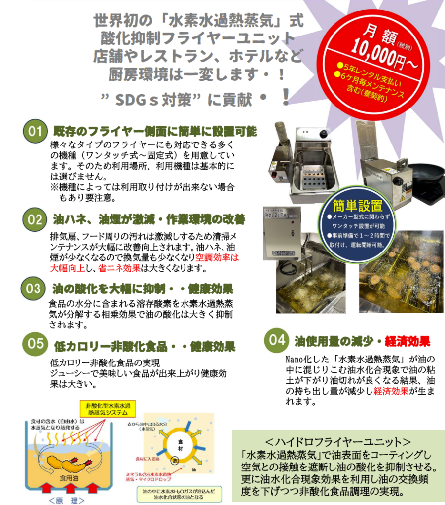 この度、弊社ではSmall Company Modelによるレンタルサービスを開始いたしました。信頼関係ある仲間と資金を拠出し合い、レンタルサービス事業を小さく始めることができる仕組みです。まずは、水素水過熱蒸気式 ハイドロフライヤーユニットを月額1万円(税別)にてお使いいただけます。